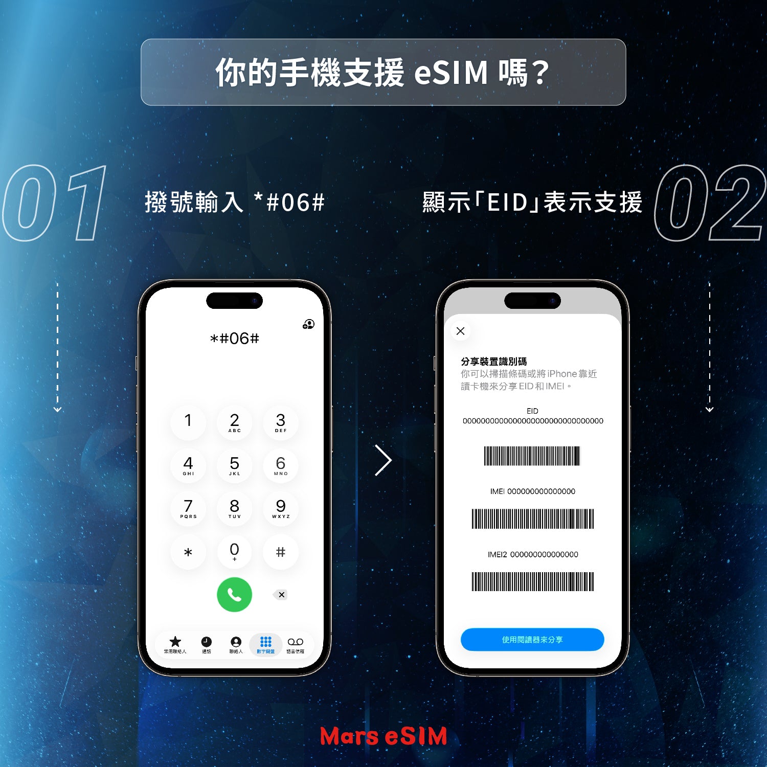 1. 需驗證手機是否支持eSIM,請於手機撥號「*#06#」。如果顯示 EID 序號,則表示您的手機支援 eSIM。請注意,此方法只能提供初步判斷,不保證完全準確。